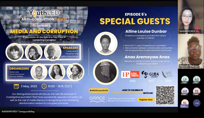 On 3 May 2023, UNODC's YouthLED Integrity Advisory Board hosted the fifth episode of the thought-provoking online dialogue series “YouthLED Anti-Corruption TALKS”, titled “Media and Corruption, in celebration of the World Press Freedom Day. This stimulating event brought together a comprehensive array of speakers, for instance young leaders, journalists, and media experts from various backgrounds and regions. By assembling such a diverse group, the event fostered rich discussions that shed light on the multifaceted challenges faced by the media in combating corruption.