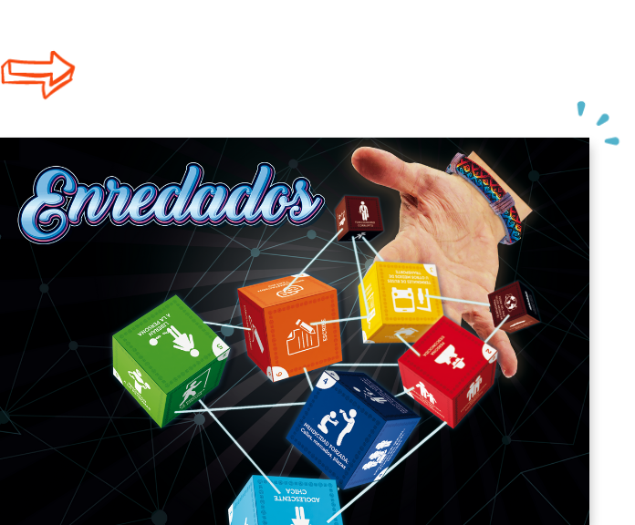 "Enredados" é um jogo interativo focado em contar histórias para aumentar a conscientização sobre o tráfico de pessoas. Através de diferentes cartas e elementos, os jogadores reúnem características (como personagens, enredo e conclusão) para construir uma história centrada no problema.