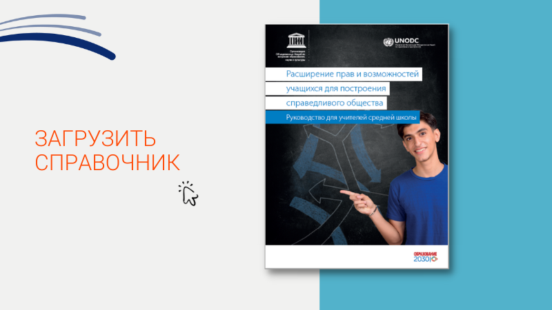 ЮНЕСКО и УНП ООН совместно опубликовали два справочника – один для начальной школы, а другой для средней школы – с тем чтобы помочь учителям в работе по расширению прав и возможностей своих учеников. Используя материал этих справочников, учителя смогут развить у учащихся способности к критическому мышлению и эмпатии – именно этим навыкам зачастую не уделяется значительного внимания в школьных программах. Интерактивные уроки повысят осведомленность учащихся о своих правах и исправят ошибочные представления о законодательстве и справедливости. Упражнения, игры и истории помогут увидеть социальные проблемы в реальном свете, побуждая учащихся занять определенную моральную позицию.